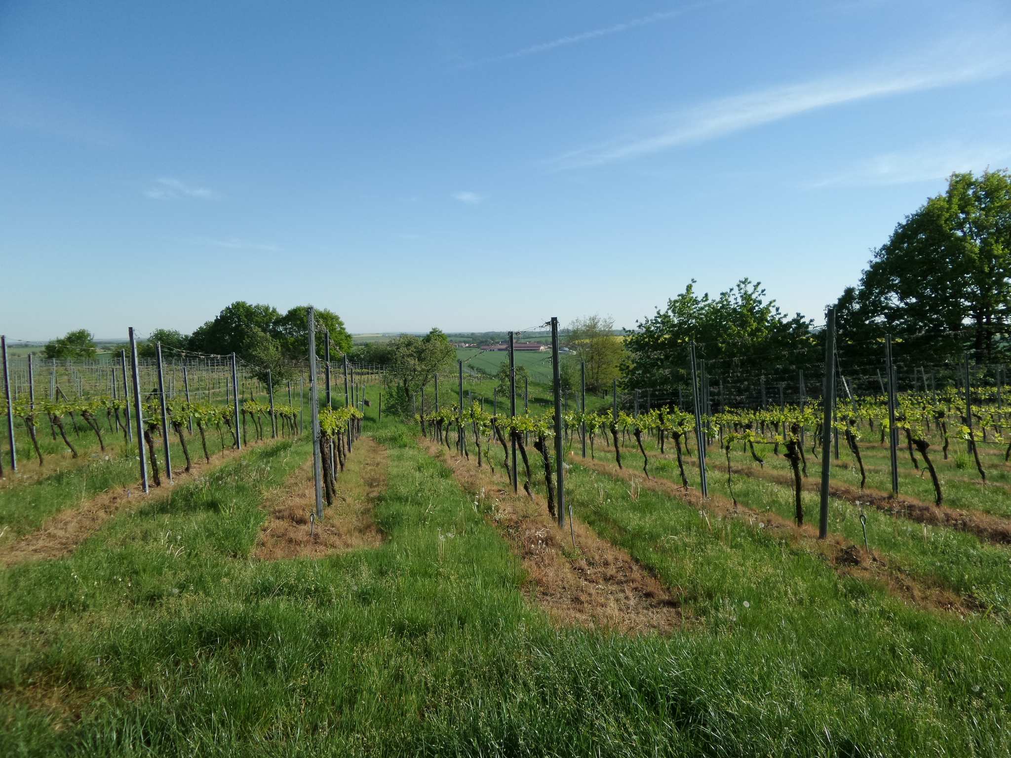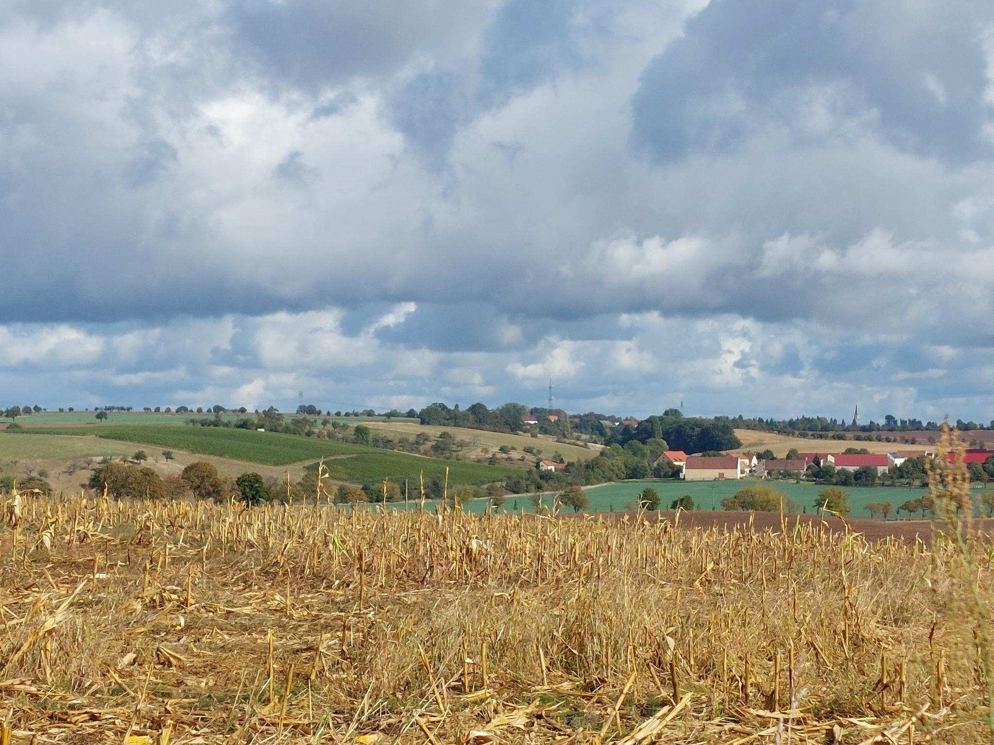Von Löbsal Richtung Naundörfel führt ein Weg am Rand des Golkwaldes entlang. Dort blickt man auf den kleinen Ort Laubach ,umgeben von Federn ,Wiesen und Weinbergen.
